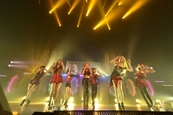 そして、メンバーが右手に猫手袋をはめ、ブッといシンセのフレーズが響き渡るとキラーチューン「Bo Peep Bo Peep」だ。会場が一体となって“ボピボピボピオー!”と歌いながらの猫ダンス大会。ホール規模のシステムで聴く、この曲のループ感の破壊力はバツグンだ。最後には、メンバーが猫手袋を客席に投げるうれしいプレゼント。本編ラストは、昨年の韓国ナンバ-1ヒット曲で、冒頭のキュリの“~ラララ I LIKE YOU”の必殺フレーズから始まる「Roly-Poly」。もう会場全体は大ディスコパーティ。最後に、全員が揃って指差しポーズを“イェー!”と決めるシーンは痛快そのもの。