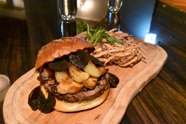 木製のプレートに乗せられた「トランプバーガー」が運ばれてきました!!