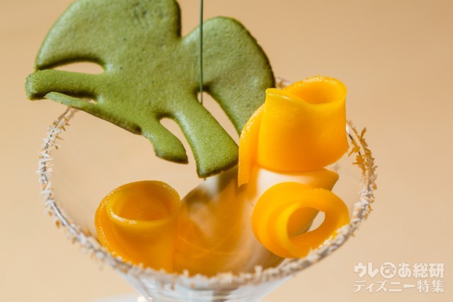 グラスのフチについたローストされたココナッツファインが、スティッチが住むハワイのビーチのようですね。