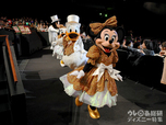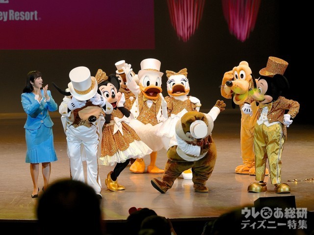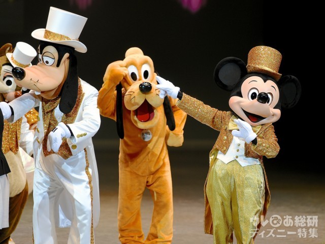 みんなはパーク・ファン・パーティーなど特別なショーの時に着る金色のコスチュームで登場。
