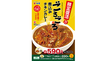 松屋フーズホールディングスは、「ごろごろ煮込みチキンカレー」の期間限定復活販売を「松屋」で4月7日10時に開始する。税込み価格は、「ごろごろ煮込みチキンカレー(みそ汁付)」の並盛が590円、大盛が690円、「カレギュウ(みそ汁付)」の並盛が600円、大盛が700円、「ハンバーグカレー(みそ汁付)」の並盛が600円、大盛が700円。スマートフォン(スマホ)決済サービス「PayPay」での支払いなら20%分がポイントバックされる。