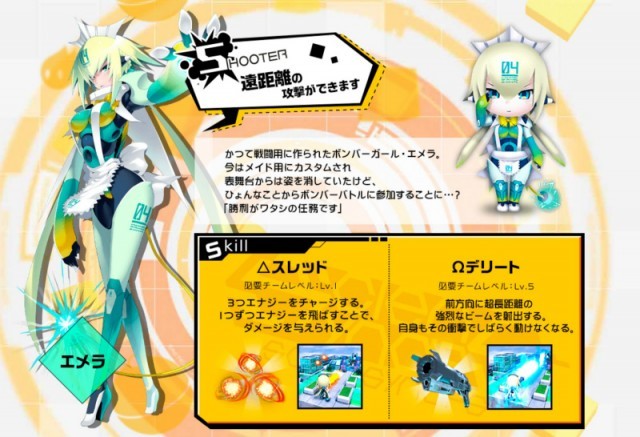 キャラクターはボンバーマスターを目指して一生懸命に戦う白うシロ、ボンバーアイドルユニット「プリティ・ボンバーズ」のリーダー・モモコ、戦うことがとにかく大好きなオレン、戦闘用に作られ現在はメイド用にカスタムされたエメラの4人が公開中。