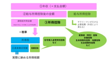 所得税は給与などの収入金額全体に対してかかるのではなく、収入金額から様々な控除額を差し引いた金額(=課税所得)に対してかかります。まずは全体的な流れを見ていきましょう。