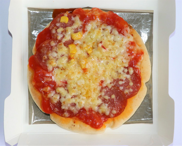 約13センチの生地にはトマトソースとチーズ、コーン、サラミなどオーソドックスなトッピング。ピザとピザパンの間のような、どこか懐かしい大人も子供も大好きな味わいです。おやつにピッタリですよ。
