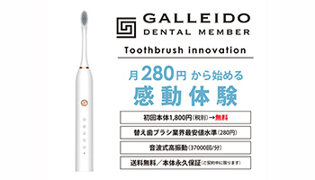 GALLEIDO DENTAL MEMBERは、定期的に電動歯ブラシの替え歯ブラシが届くサービス。高振動歯ブラシの本体価格は無料で、替え歯ブラシを月に1本、税別280円で利用できる。替え歯ブラシの送料は無料。