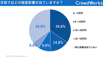 調査対象者に、新型コロナウイルス感染症に伴うさまざまな影響によって、収入がどれくらい減ったかを尋ねたところ、65.1%が年収が減っていることが分かった。30%以上が月額5万円以上、収入が減っており、月額10万円以上の収入減となった人も15%を超えている。