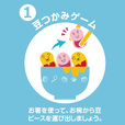 様々な形の豆ピースを箸で運び出す基本の「豆つかみゲーム」のほか、数種類のゲームを楽しみながら、箸のマナーを学ぶことが出来ます。
