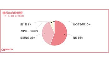 調査対象者に、普段の自炊頻度を尋ねたところ、「毎日」が56%、「ほぼ毎日」が38%で、90%以上を占めた。