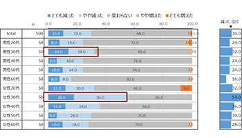 まず、直近3カ月での世帯収入の変化を聞くと、収入が減っている世帯がおよそ3割程度ある中、30代世帯の収入減が際立つ結果となった。特に、女性30代は半数以上で収入が減少している状況にあり、非正規雇用者の影響が大きいと推察される。