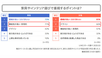 男女とも家具選びで重視するのは「価格・コスパ」、LINEの調査で明らかに
