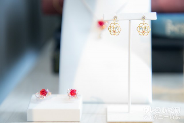 ネックレス、ピアス、指輪などバラをモチーフにしたアクセサリーの展示が多数。