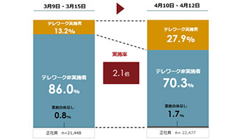 緊急事態宣言の発令後テレワーク実施率が2倍に、4月時点の実施率は27.9%