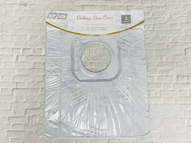 こんなものまで?と思ってしまうのが大理石柄のコンロカバー。大理石柄にグレーとゴールドのオシャレなロゴがランダムに配置されています。