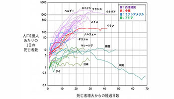 人口1億人当たりの1日の死亡者数は、世界の多くの国で感染拡大30日後にほぼ一定となり、その推定値(中央値)が西洋諸国(欧州、北米、オセアニアを含む)で1180人に対し、中東で128人、ラテンアメリカで97人、アジア(中東を除く)で7人だった。このように死亡者数から解析すると新型コロナ感染症の広がり方には、西洋とアジア地域で100倍程度の著しい地域差がある。