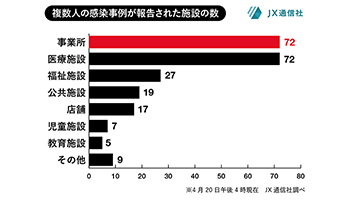 JX通信社は、独自に収集・分析した全国の新型コロナウイルス感染症の感染事例が報告された施設に関する情報を4月21日に公開した。