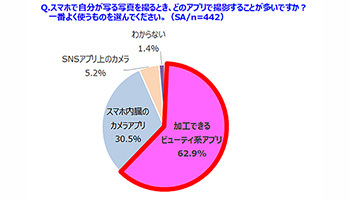 調査対象者に、スマートフォンで自撮りをする際、そのアプリで撮影することが多いかを尋ねたところ、6割以上が「加工ができるビューティ系アプリ」と回答しており、「スマートフォン内蔵のカメラアプリ」の2倍以上に達した。