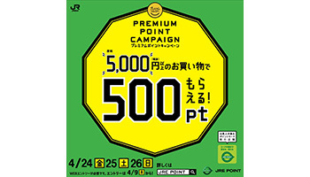 「月末の金曜日は、早めに仕事を終えて豊かにすごす」をコンセプトにした2017年2月24日開始の「プレミアムフライデー」にちなんだキャンペーンで、月によって条件が異なる。2020年4月度は、4月24~26日の月末3日間を対象に、JRE POINTカードユーザーが期間中に合計税別5000円以上購入すると、もれなくJRE POINT500ポイントをプレゼントする。