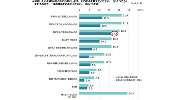 今月の家計の支出を節約したい金額が「0円」の「節約したくない」派の人に、その理由を尋ねたところ「節約のために我慢したくたいため」(21.4%)が最も多く、「節約してまでほしいものがないため」(21.3%)、「節約にまわす余裕がないため」(20.3%)が続く。