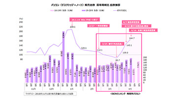 【BCN速報値】全国の主要家電量販店・ネットショップのPOSデータを集計した「BCNランキング」によると、デスクトップとノートを合算した4月第3週(4月13~19日)のPC販売台数は前年同期比164.7%と、前週から19.6ポイント続伸した。4月16日に新型コロナウイルス対策として緊急事態宣言の対象が全国に拡大したことで、今後はテレワーク需要が首都圏から地方の家電量販店にも波及することが予想される。