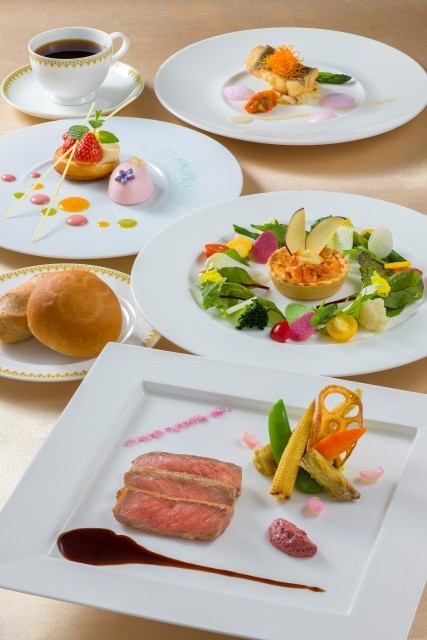 スイスチャードと桜海老のキッシュ、サラダ添え 的鯛のフリット、シャンパーニュソース 黒毛和牛のロースト、ヴァンルージュソースとカシスマスタード、パン、オレンジメイプルケーキとサクラフロマージュムース、ソフトドリンクのチョイス