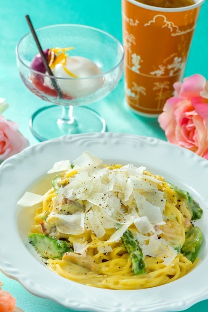 スパゲッティ・カルボナーラ、ミルクとマンゴーのプリン、ソフトドリンクのチョイス