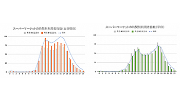 スーパーマーケットの時間別利用者指数。平日13時~16時あたりがねらい目