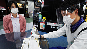 また、商品の設置や工事、契約書類をチェックするためにヒアリングが必要となる円卓では、フェースガードをつけて接客する対策も取り入れている。