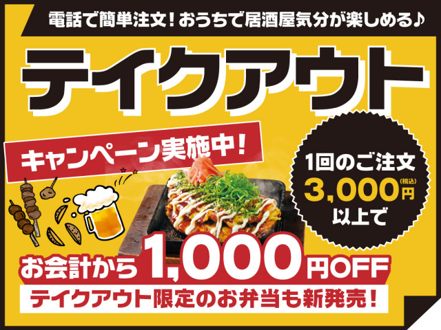 また、2020年5月10日(日)までの期間限定でテイクアウトキャンペーンも実施中。一回で3,000円(税込)以上注文の場合、1,000円OFFになるといったキャンペーンです。