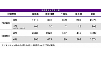 多くの新築マンションの販売センターやモデルルームでは、販売を自粛している状況が続いている。特に、4月7日に発令された緊急事態宣言で一気に自粛モードが加速した。そこで、今回の新型コロナウイルスによって新築マンションの供給戸数にどれだけ影響が出たかを知るため、3月と4月を前年同月比でまとめた(4月は20日までの集計対象)。