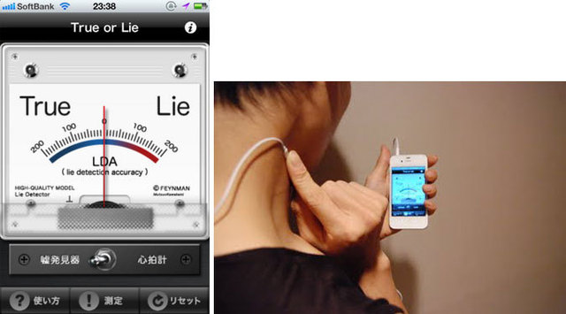 脈拍計測といえばやっぱり嘘!? と、いうことで、こちらはアップル純正のイヤホンについているマイクを脈にあてることで、その人の本音をチェック!。「こいつ、うそ臭い」と思ったあなた、ぜひ試してみてください。ちなみに、このアプリでも脈拍計測器としてしようできるので、ひとつで2度美味しいかも。