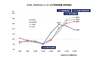 4月20日週は、東京圏が136.0%だったのに対し、大阪圏が184.5%、地方が176.0%、名古屋圏が168.2%を記録した。テレワーク特需を背景にしたPC需要が、東京圏とタイミングがずれる形で全国に広がっている様子が分かる。(BCN・細田 立圭志)