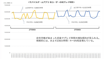 モバイルゲームアプリユーザー(15~69歳)の総プレー時間は、2月が平日で平均5098万時間、土日祝日で平均5920万時間、3月が平日で平均5335万時間、土日祝日で平均6152万時間と、2月末の外出自粛要請前後で4~5%増加している。