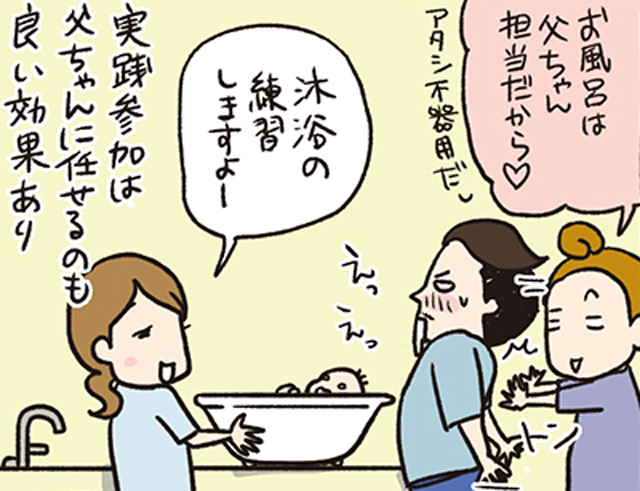 最後に登場した沐浴練習では外面の良い性質を利用して、ゲシゲシと助産師さんの前にダンナを送り出し、まんまと実践させてやりました。