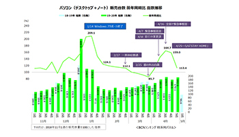 【BCN速報値】 ゴールデンウイーク(GW)前半戦(4月27日~5月3日)のデスクトップとノートを合算したPC販売台数は、前年同期比113.4%となり前週から45.6ポイントの大幅なダウンとなった。ただ、これは前年のGWの10連休との比較で下がったもので、台数規模そのものは前週よりも上回っており、高水準をキープしている。全国の主要家電量販店・ネットショップのPOSデータを集計した「BCNランキング」で分かった。