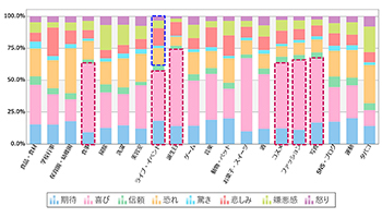 「食事」「誕生日」「コスメ」「ファッション」「写真」などは「喜び」「期待」の感情が占める割合が相対的に高く、とりわけ「誕生日」でウェブシステムを利用して、いつもよりも多くの参加者に祝われたという発言が、「ファッション」で家でできるおしゃれやルームウェアを新たに購入したといった発言がみられる。
