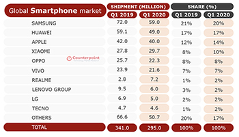 調査によれば、世界のスマホ市場はこれまでにないスピードで縮小し、2020年第1四半期が前年同期と比較して13%減少している。四半期当たりの台数が3億台を下回ったのは、14年第4四半期以来、初めて。19年第4四半期からの市場復調の兆しは、新型コロナウイルス感染症の感染拡大によって再び不透明となった。