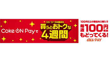 au PAYの対応を記念し、日本コカ・コーラは、Coke ONのキャッシュレス決済機能「Coke ON Pay」に5月14日以降にau PAYを登録し、100円以上のコカ・コーラ社製品をCoke ON Pay対応自販機で購入すると、もれなく全員に毎週100円相当のPontaポイントをプレゼントする「Coke ON Payでコカ・コーラ社製品を買うとおトクな4週間」キャンペーンを5月18日から実施する。
