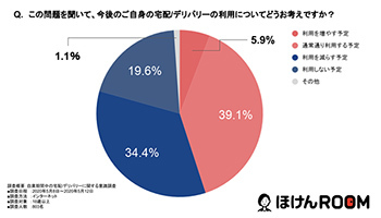 今後の宅配・デリバリーの利用意向を尋ねた質問では、「通常通り利用する予定」(39.1%)が最多で、「利用を増やす予定」(5.9%)と合わせて79.0%の人が宅配・デリバリーの利用を続ける意向であることが明らかになった。
