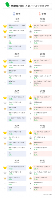 全体の1位は、オリジナルフレーバーが多さが特徴の『ハーゲンダッツミニカップ』。年代が上がっていくにつれて人気も高まる傾向です。