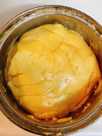 生地をホイッパーで混ぜ、ボール状にできるくらいまでになったら、火から下ろし、5〜7分休ませます。