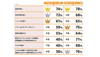 一方で、利用後に満足に感じている機能については、音楽を聴く(78%)、スマートフォンと接続して外出先から操作(76%)、アラームやタイマーの設定(75%)、音声による家電の操作(71%)、ラジオを聴く(68%)といった機能が挙げられた。