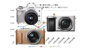シリーズ別の販売台数シェアランキングでは、キヤノン「EOS Kiss M」がトップを死守(11.4%)。2位はソニー「α6400」(9.5%)で、オリンパスの「OLYMPUS PEN E-PL9」(9.0%)を0.5ポイント上回った。(BCN・大蔵 大輔)
