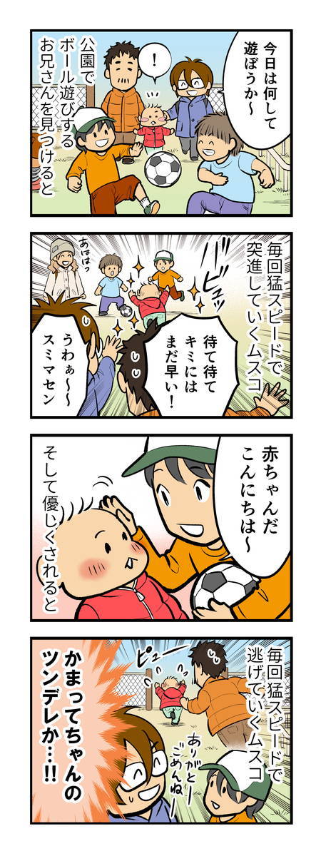 ある日、サッカーをしていた小学生男子2人組に突進してはワタシに引き離されるという行為を10回も繰り返したため、いい加減ムスコの存在に気付いたサッカー少年くんたちが、