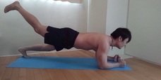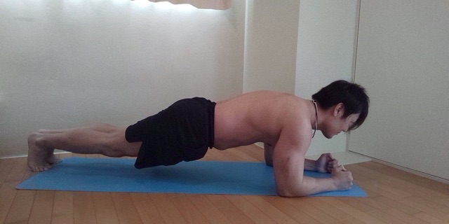 1.プランクの体勢を作る(床に肘を付いて、脚を伸ばして爪先だけ付いた状態にする。お尻が上がらないよう、頭から爪先まで一直線にすること)