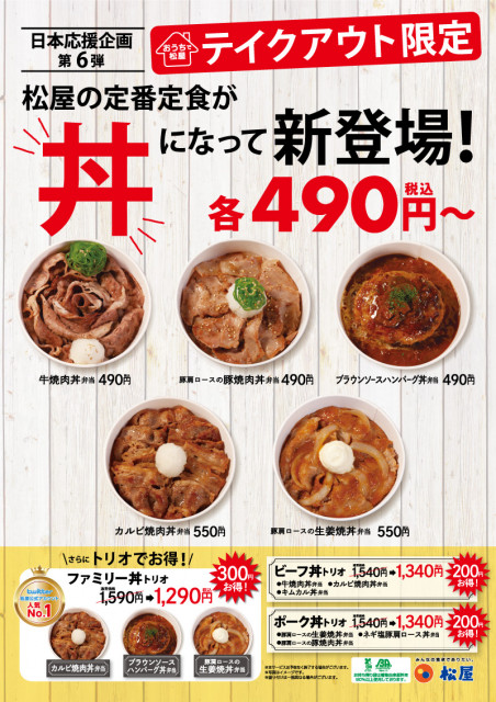 松屋各店にて、人気の定番定食が「丼」になって新登場。2020年5月19日(火)より、テイクアウト限定で販売中です。