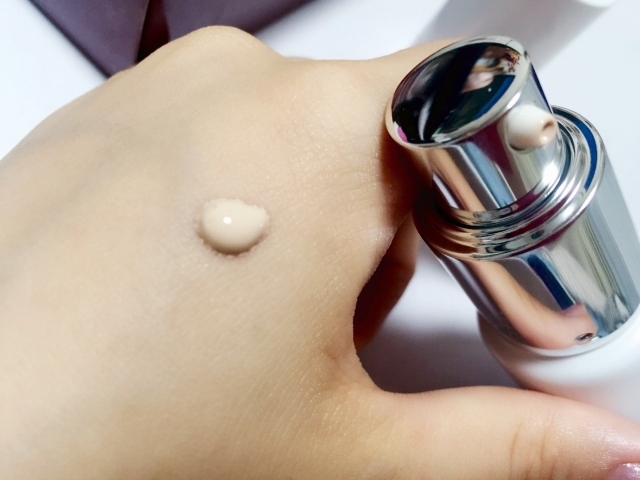 まず、小豆粒大くらいのBBクリームまたはCCクリームを手の甲に取ります。記載されている量通り使うと、厚塗り感が出てしまうことも。ここではナチュラル感を重視するので、このくらいの量がベターです。