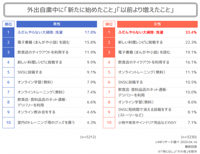 LINEリサーチが2020年4月16日、日本全国の15歳~69歳の男女を対象に実施した「新型コロナウイルスに関する調査(第4回)」の結果では、外出自粛中に「新たに始めたこと」「以前より利用が増えたこと」についての問いに対して、「ふだんやらない大掃除・洗濯」が1位となりました。
