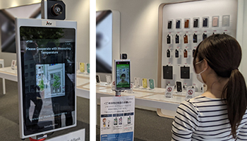 今回導入するのは、JCVのAI検温ソリューション「SenseThunder(センス・サンダー)」。AI(人工知能)を活用した顔認識技術と赤外線カメラによって、対象者がマスクや眼鏡を着用したままでも、所要時間0.5秒でスピーディーに体温を測定する。SenseThunderは検温と顔認証による入退館管理を同時に行う機能を備えているが、ソフトバンクショップとワイモバイルショップでは検温のみ行う。