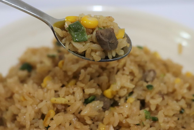 最後に紹介するのは、ステーキ専門店「いきなり!ステーキ」監修のビーフガーリックピラフ。お店で提供しているガーリックライスをベースに、ステーキにかける秘伝のソースで味付けされています。