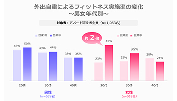 フィットネス実施率を男女年代別でみると、男性は大きな変化がない一方で、女性は外出自粛中のフィットネス実施率が自粛前を大きく上回った。20代女性の自粛中のフィットネス実施率は、自粛前と比較して約2倍の45%、30代女性も自粛前の1.4倍に達している。